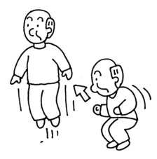 両足を曲げて伸ばすことによって地面から離れ、上方に動くこと。例えば、片足でのジャンプ、ホップ、スキップ、水中へのジャンプや飛び込み。