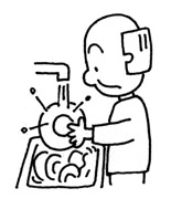 調理後の後片づけ。例えば、皿、鉢、鍋、調理道具を洗うこと。調理や、食事の場所のテーブルや床を掃除すること。 |